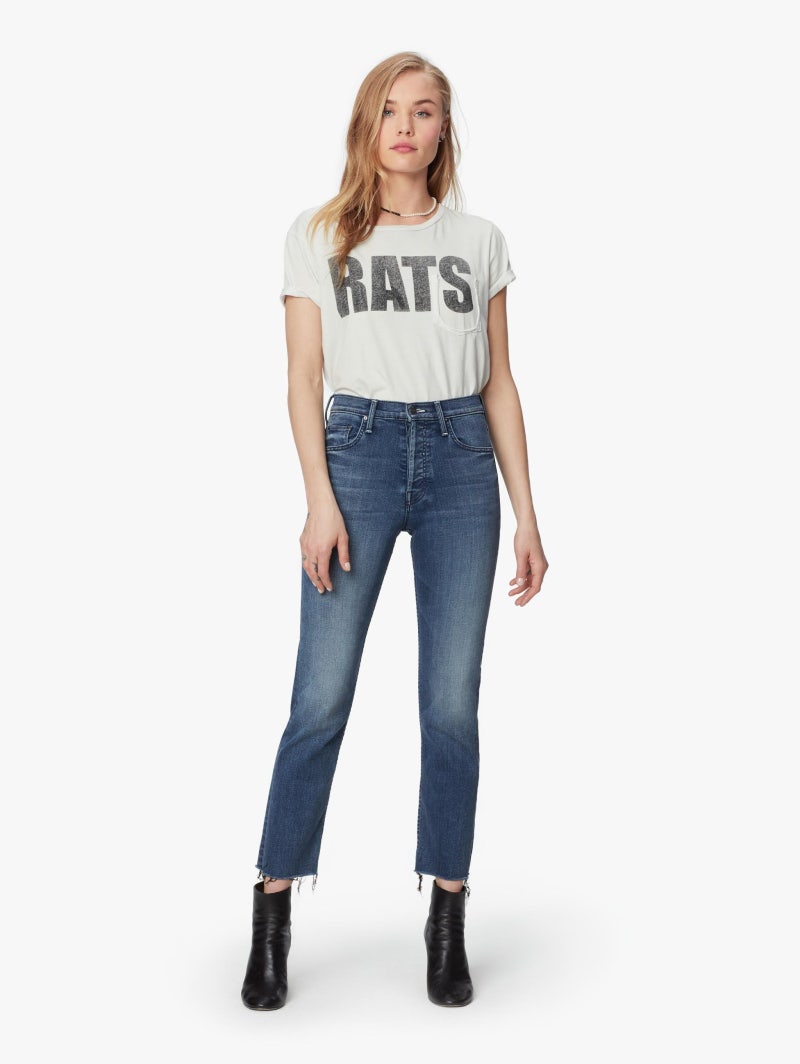 마더 청바지 톰캣 앵클진 역시 라인이 일자핏으로 나와 캐주얼한 룩에 어울리며 청바지에 흰색 티셔츠 조합이면 어디에나 멋스럽게 코디가 가능합니다.